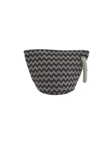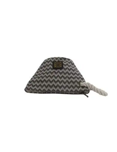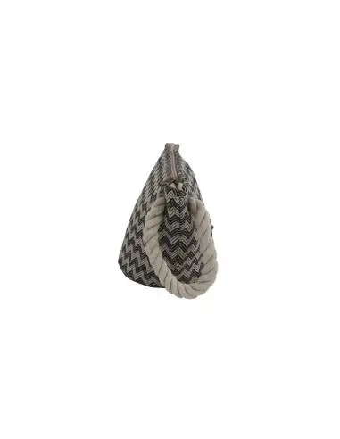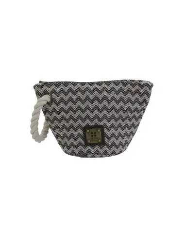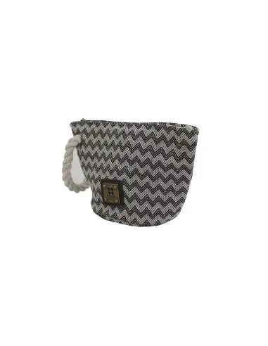 Original bolso de mano hecho con lona en color azul marino estampado con líneas en zigzag blancas y con asa de muñeca de cuerda trenzada.