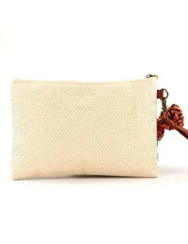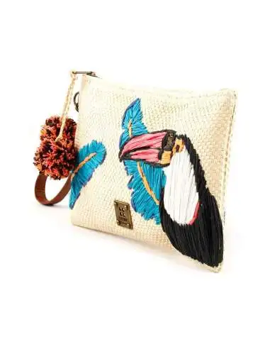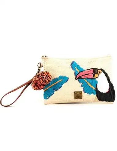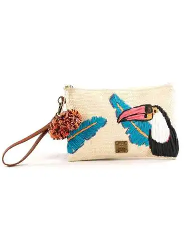 Bolso de mano con cierre cremallera y bordado con un bonito tucán. Su interior está forrado y lleva un bolsillo multiusos. Tiene una asa de mano con unas borlas de lana decorando para un mejor agarre.