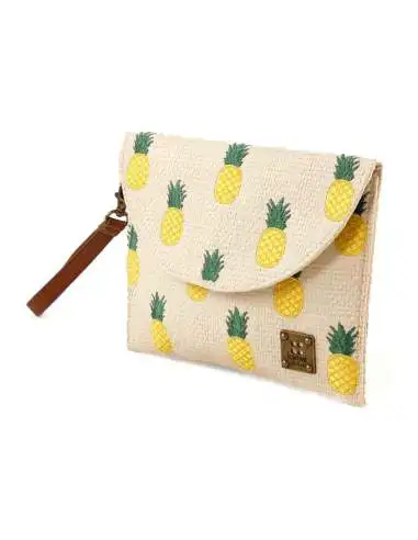 Original bolso de mano con solapa y con motivos de piñas. Interior forrado en textil. Incluye asa de mano de Ecopiel para un mejor agarre.